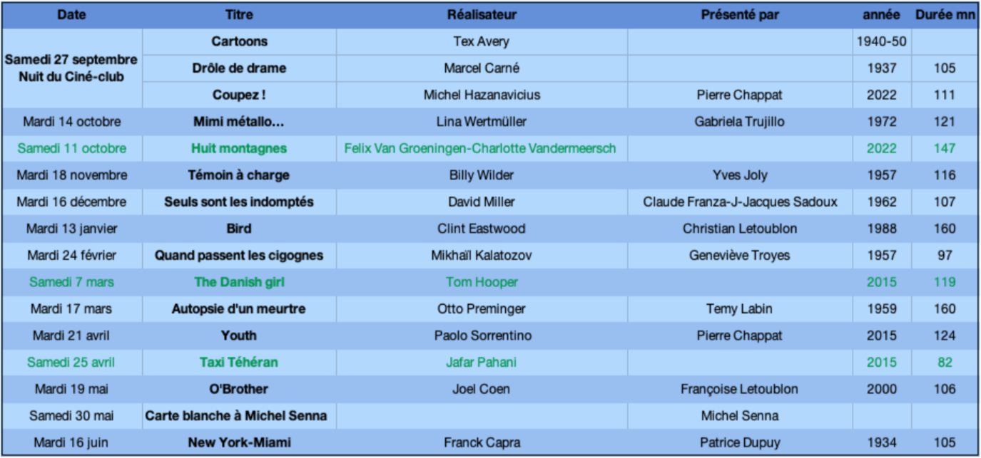 | Samedi 27 septembre Nuit du ciné-club 17h | Cartoons Drôle de drame Coupez! | Tex Avery (1945) 1h10 Marcel Carné (1937)1h45 Michel Hazanavicius (2022) 1h50 | Olivier Allain Témy Labin Pierre Chappat |